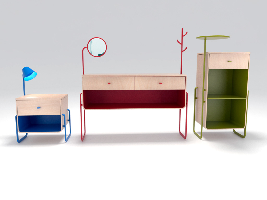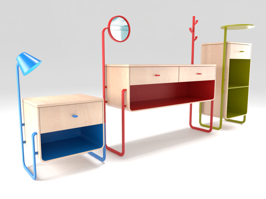 Pedro, Ana y Lucas, así fue como llamamos nuestro conjunto de muebles, el cual está conformado por una mesa de noche, un recibidor y un mueble auxiliar, respectivamente. Cada uno de ellos puede recibir 4 tipos de accesorios que serían una lámpara, un espejo, un perchero y una mesa rotatoria para que el usuario escoja como desea que sea su amigo incondicional de acuerdo a sus necesidades. La parte central está hecha en madera laminada con terminación en haya y las patas con tubos metálicos de geometría rectangular. El usuario tiene la posibilidad de escoger el color que vaya más acorde con su espacio y gusto, para las patas, los accesorios y el interior del módulo central.